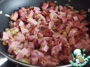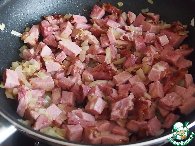 • В большой сковороде на раскаленном масле поджарить лук. Затем к нему добавить мясо и немного обжарить.