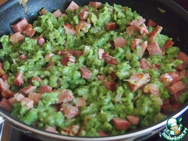 • Добавить в сковороду галушки, перемешать, прогреть, возможно, посолить. Соль в рецепте не указываю, так как и мясо все-равно остается солоноватое и сыр тоже соленый, но вы ориентируйтесь по своему вкусу.