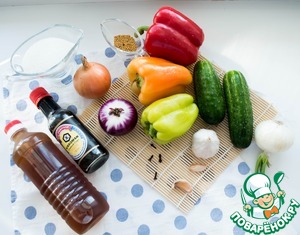Овощи нарезать небольшим кубиком, чеснок - дольками. Посолить, добавить соевый соус ТМ Kikkoman и залить водой на 1/3. Убрать в холодильник настаиваться на несколько часов.