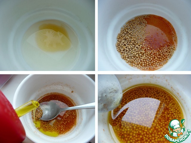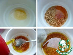 Для заправки смешать винный уксус, мед, горчицу, соль и перец. Тонкой струйкой влить оливковое масло и тщательно перемешать заправку.