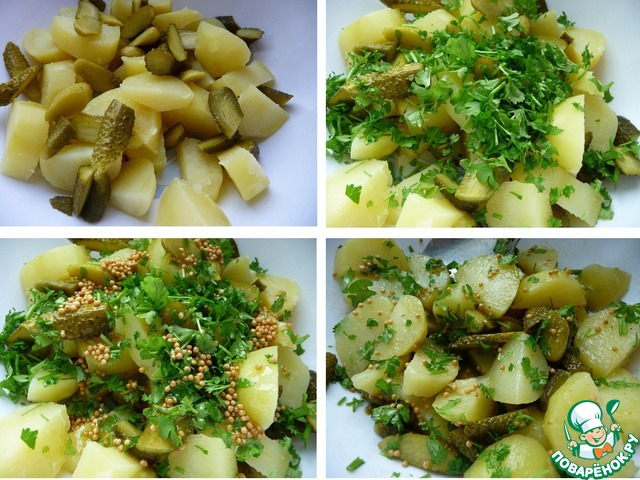 Предлагаю салат из молодого картофеля с корнишонами. Салат простой, сытный, пикантный. Этот салат может служить как гарниром, так и самостоятельным ужином или обедом. Автор рецепта Зоряна Ивченко, огромное ей спасибо. В салат можно добавить зеленый лук, но у нас он очень жесткий, поэтому я его не брала.