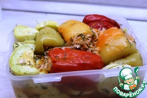 На дно емкости выкладываем половину помятых руками укропных стеблей и порезанный колечками острый перец. Далее слоями или в произвольном порядке укладываем фаршированные перцы и кусочки кабачка. Слои пересыпаем смесью рубленого чеснока и укропа, а также добавляем желаемое количество острого перца и перца горошком.