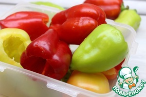 Перцы очистить от семян и бланшировать. Я бланширую в микроволновке. На дно емкости наливаю пол стакана воды, укладываю перцы, плотно накрываю крышкой и в микроволновую печь на 7 минут. Мощность 800W.