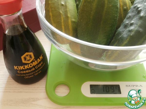 Натереть огурцы на терке для корейской моркови с использованием насадки для средней шинковки. Добавить соевый соус и перемешать.