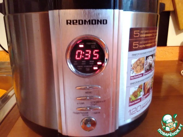 Готовить в режиме "Выпечка" 35 минут. Мощность моей мультиварки 900 Ватт, Вы можете изменить время приготовления в зависимости от мощности Вашей мультиварки. После окончания программы оставить в режиме "Подогрев" на 5-10 минут. Я оставляю и дольше, мне кажется, чем дольше простоит, тем нежнее вкус.