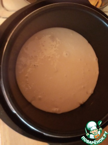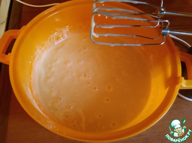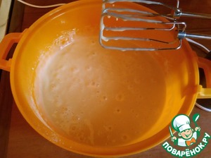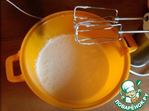 Продолжая взбивать, добавить подогретое молоко, смешанное с растопленным сливочным маслом.