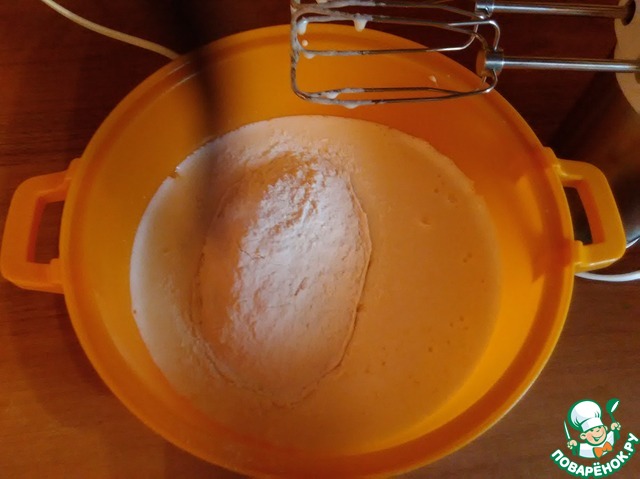 Добавить просеянную муку, разрыхлитель и ванильный сахар, взбить.