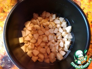 Яблоки вымыть, очистить от кожуры, удалить сердцевину, нарезать крупными ломтиками.