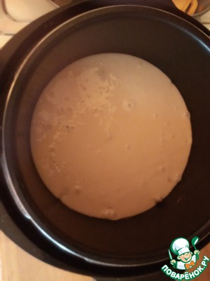 Сверху вылить тесто, оно должно быть не густое, льющееся.