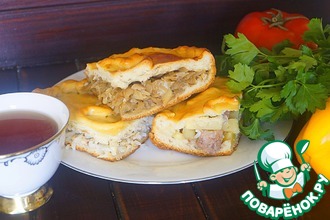Начинка. Пока тесто подходит, делаем начинку. Варим рис до готовности. Капусту шинкуем и также варим до готовности. Затем отвар сливаем, капусту охлаждаем. Смешиваем с рисом. Добавляем соленые огурцы (либо натертые на терке, либо нарезанные мелкими кубиками), нарезанные кубиками копченные колбаски и тертый сыр. Вымешиваем начинку.