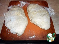 Вымешать тесто. Как только образуется ком теста, слегка липнущий, то посыпать немного мукой по поверхности. Накрыть пленкой или полотенцем и поставить в разогретую до 55 градусов духовку. Через 10 минут духовку выключить, а тесто оставить в духовке на 1 час. Затем тесто обмять, снова хорошо промесить и оставить в духовке еще на 30 минут. Вымешанное тесто хорошо раскатывается и не липнет к рукам. Если нужно, то добавлять еще муки по чуть-чуть. Тесто разделить на 2 части -