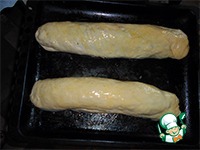 Разогреваем духовку до 200 градусов. Первую часть теста раскатываем в прямоугольник. На край кладем половину начинки. Скатываем в рулет. Концы защипываем. И выкладываем на смазанный противень. Также поступаем со второй частью теста. Смазываем рулеты смесью из яичного желтка и растительного масла и ставим в духовку.