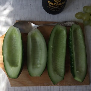 Огурцы разрежьте вдоль на 2 половинки. Удалите семена с помощью маленькой ложки.