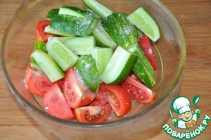 Берём огурцы и крепкие спелые помидоры, моем. Огурцы режем брусками, помидоры пополам или на четвертинки в зависимости от размера. Засыпаем солью, отставляем на 15 минут.