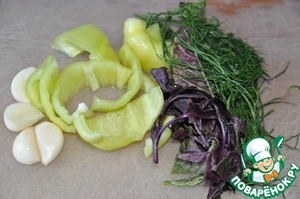 Чистим чеснок и болгарский перец, режем. Моем зелень: укроп и базилик, всё помещаем в блендер и измельчаем.