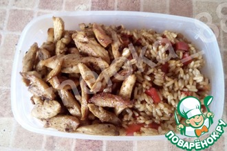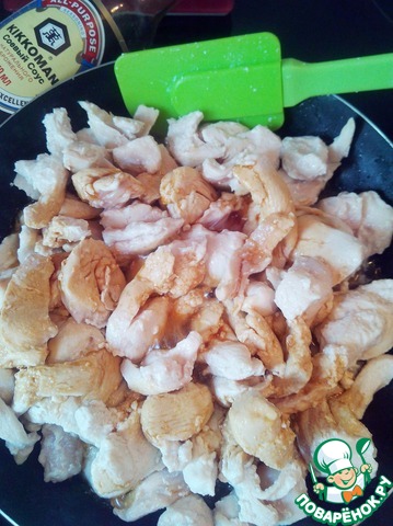 Отдельно обжарить куриное филе с добавлением соевого соуса, после чего смешать с овощами