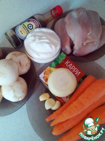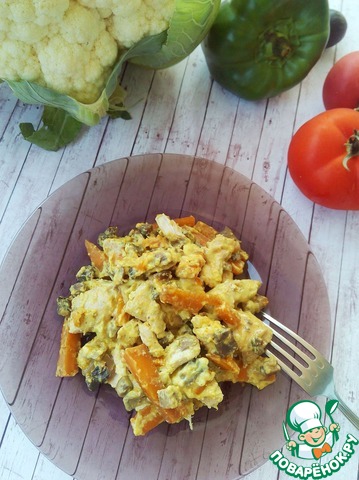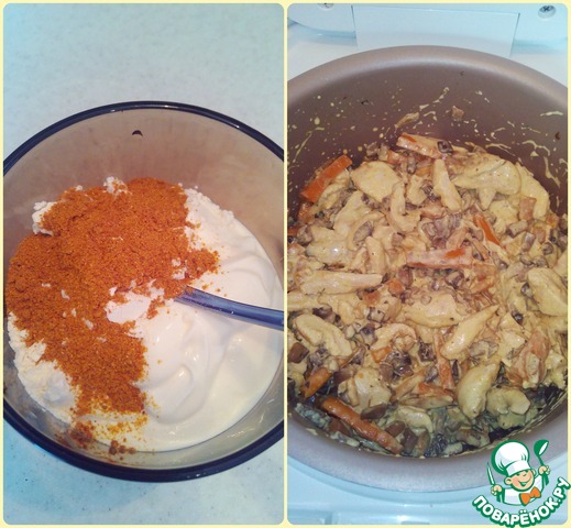 В сметану добавить муку и карри, перемешать, залить соусом курицу с овощами и потушить 10-15 минут