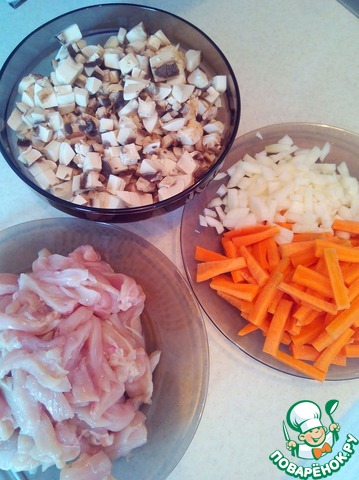 Куриное филе нарезать тонкой соломкой, морковь брусочками, лук и грибы кубиками