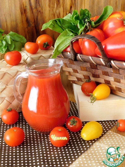 Оставшийся томатный сок нагреем, не доводя до кипения ( примерно до 60-70 градусов). Желатин отожмём, добавим в горячий томатный сок и перемешаем до полного растворения желатина.