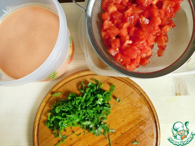 Пока смесь остывает, подготовим зеленый лук и помидоры. Лук нарезаем тонкими колечками. С томатов снимаем кожицу и удаляем семена. Мякоть нарезаем мелким кубиком и откидываем на сито, что бы стекла лишняя жидкость (примерно на 20-30 минут).