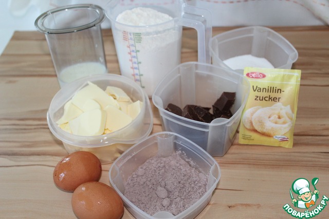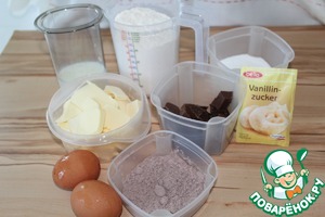 • Подготовить необходимые ингредиенты для теста - 150 г сливочное масло, 150 г сахар, 1 пакетик Ванильный сахар, 2 Яйца, Щепотка соли, 250 г мука, 1/2 пак. разрыхлитель, 75 мл. молоко, 1/2 пак. Шоколадный пудинг, 100 г горький шоколад.