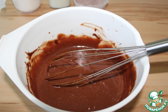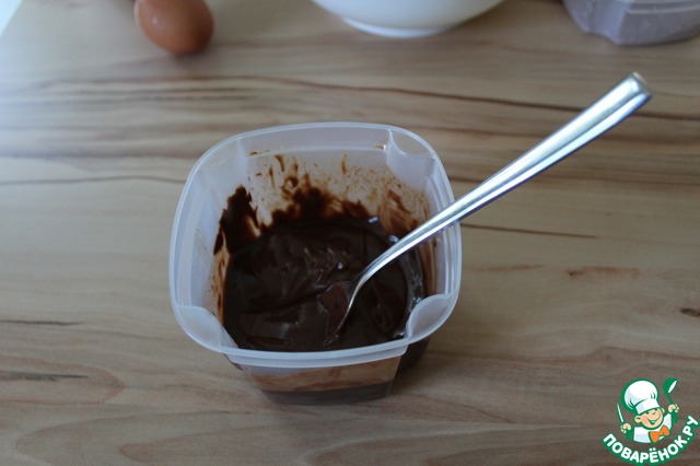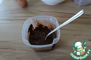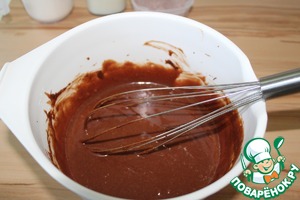 • Масло мягкое, Сахар, Ванильный сахар, Яйца и растопленый шоколад перемешать венчиком до кремообразного состояния.