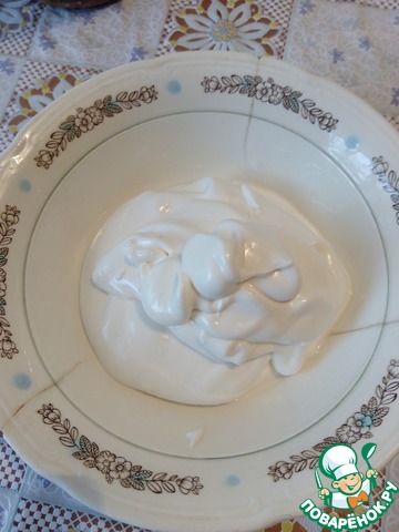 Белки взбиваем со 100 граммами сахара и ванилином до устойчивых пиков.