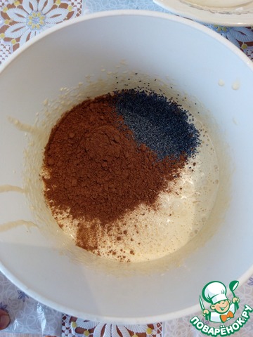 Желтки взбиваем с оставшимся сахаром до загустения и просветления массы. Добавляем к ним мак и какао, затем тщательно перемешиваем.