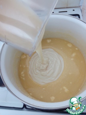 Затем в желтково-шоколадную массу вводим лимонад, масло и соду, опять мешаем.