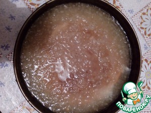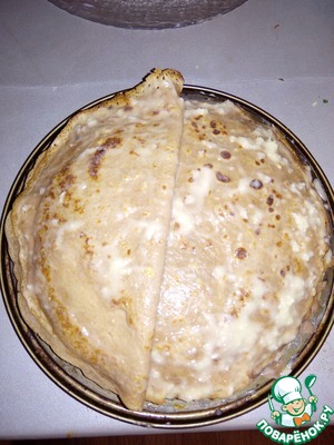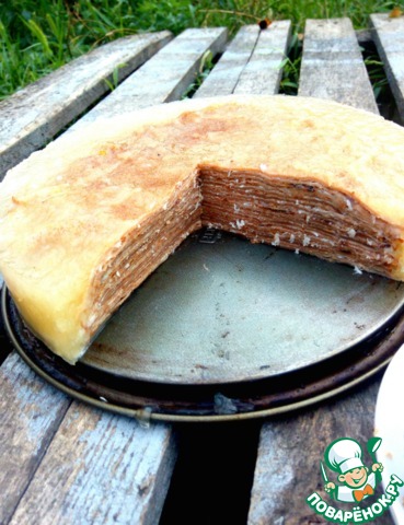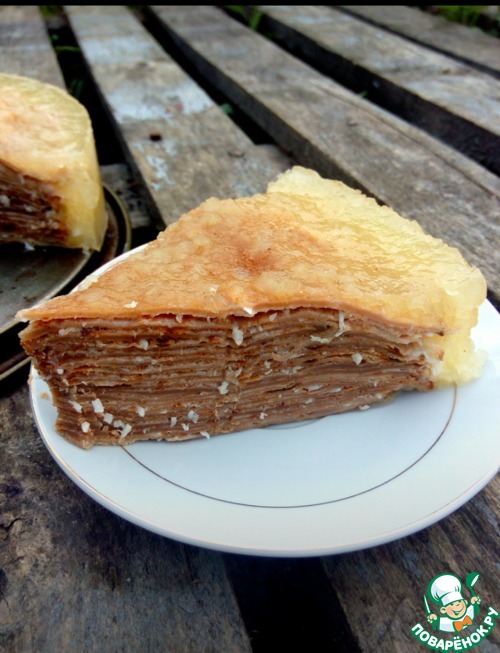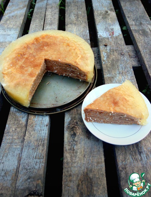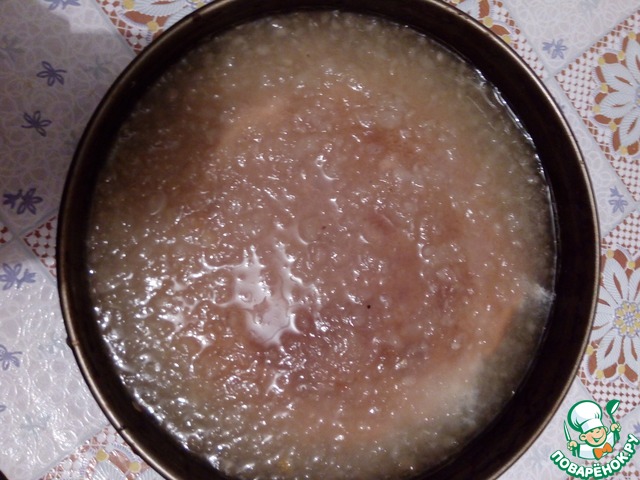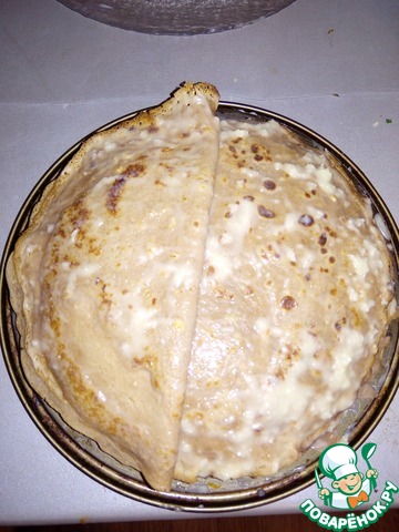 Блинный торт помещаем в разъемную форму и заливаем дынным желе. Убираем в холодильник до полного застывания.
