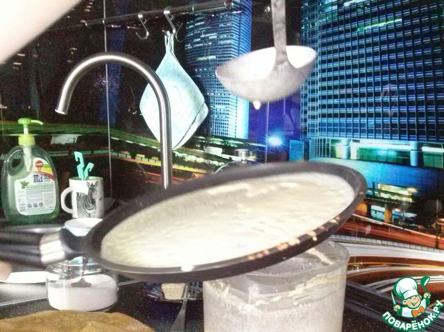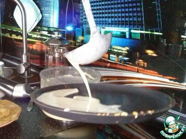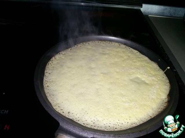 Разогреваем сковороду, она должна быть очень горячей (на моей печи из 9 степеней нагрева, я использую 7) и наливаем тесто на сковороду распределяя его по всей площади.