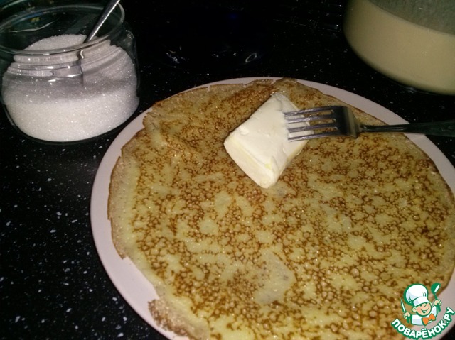 Вторая сторона печется меньше по времени (приблизительно 1 минуту). Со сковороды отправляем наш блинчик на тарелку, смазываем сливочным маслом (я его не растапливаю, а накалываю на вилку и провожу по блину, так точно не будет много масла на ваших блинчиках) и посыпаем сахаром (здесь по вашему вкусу, мои любят не слишком сладкие, поэтому я кладу чуть меньше половины чайной ложки)