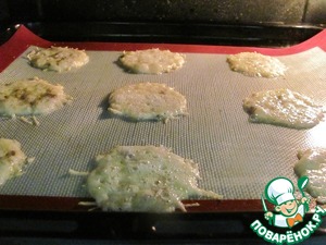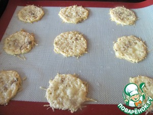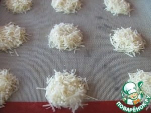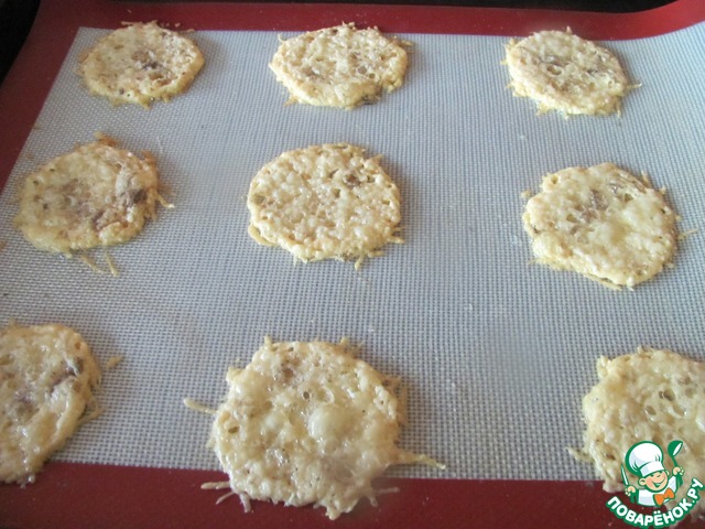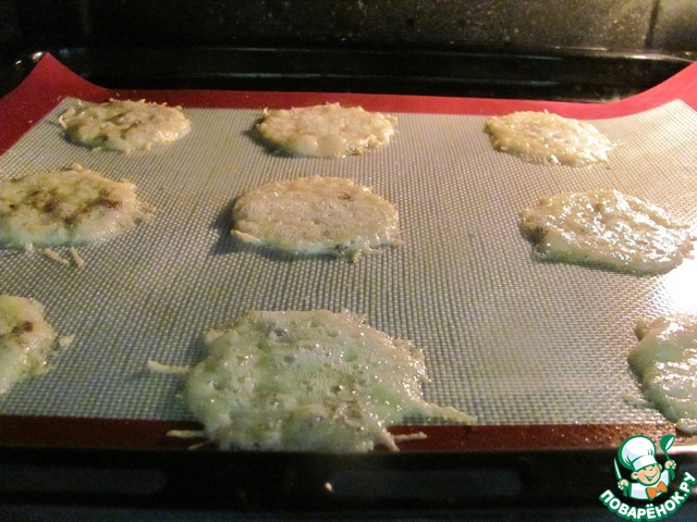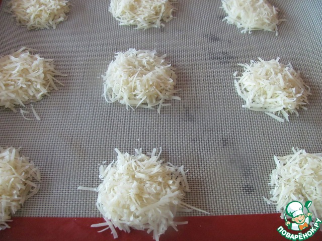 Разложить на противень, застеленный ковриком или очень хорошего качества бумагой для выпечки. Я брала примерно столовую ложку сыра и выкладывала на расстоянии друг от друга горки, которые нужно немного разровнять. Сыр посыпать черным молотым перцем.