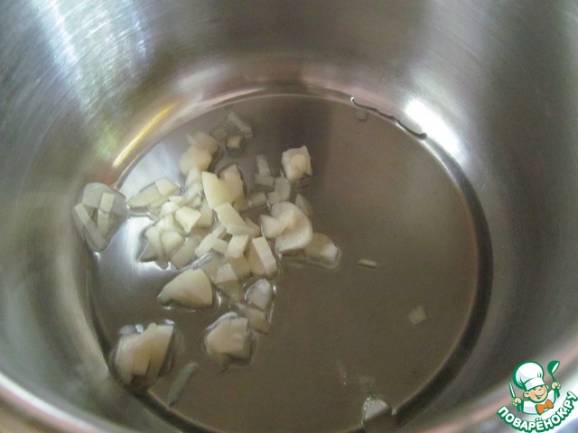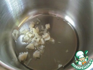 В разогретое масло положить мелко порезанный чеснок. Помешивая, дождаться, чтобы чеснок дал запах, но не поджарился.