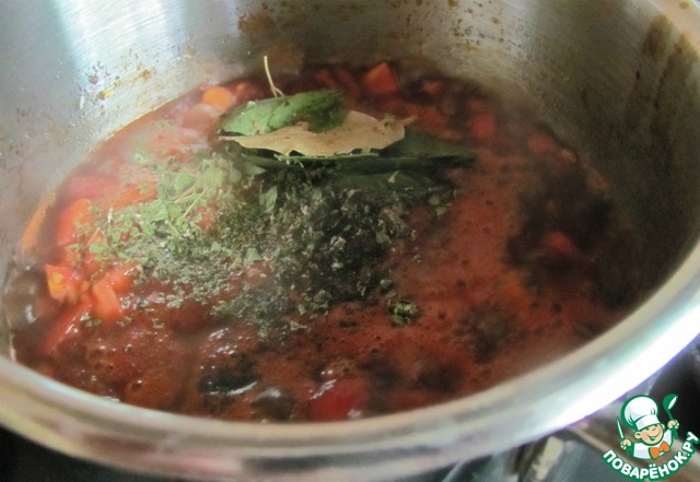 Перемешать, дать закипеть. Добавить орегано, перец, сахар. Положить листики базилика и лавровый лист. При желании можно добавить хлопья чили. Все перемешать.