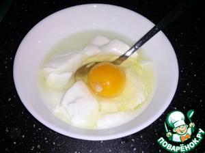 Берем простоквашу, добавляем яйцо, сметану и тщательно перемешиваем.