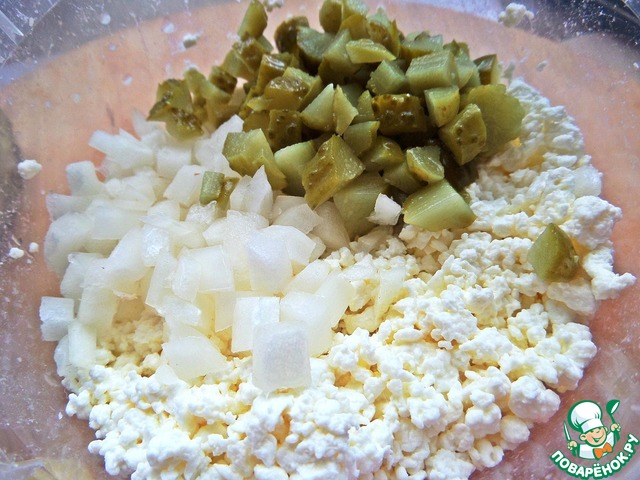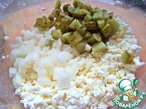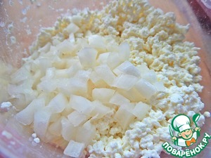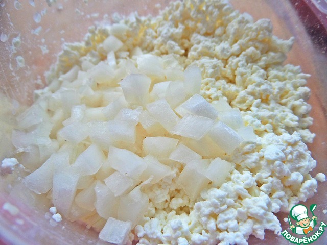 Соединить лук с творогом.