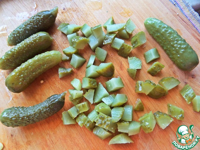 Маринованные огурчики нарезать мелко. В оригинале были артишоки.