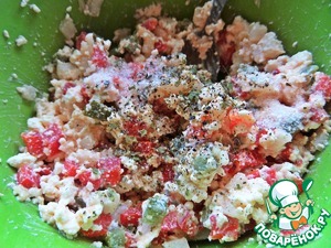 Однажды увидела подобную закуску у Ю. Высоцкой, но там в начинке были заявлены артишоки, а их нет... И вот решила повторить со своим дополнением: сладкий перец, корнишоны, мягкий сыр. Получилось нежно и очень вкусно с пармезановой корочкой. Да, такой начинкой можно нафаршировать помидоры или просто намазать гренки и запекать не обязательно.