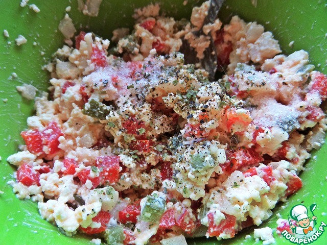 Расплавленные два вида сыра очень дополняют овощи и творожную основу.