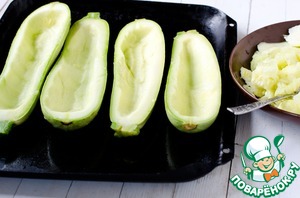 Кабачки разрезать вдоль пополам. Из каждой половины удалить ложкой часть мякоти, оставив бортики. Мякоть отложить, она пойдет в начинку.