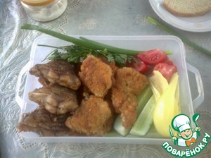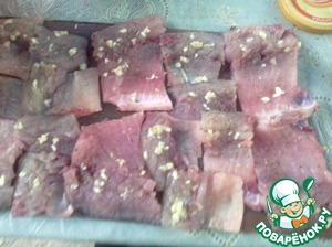• Режем филе на порционные кусочки, солим, перчим, и немного мелко порезанного чеснока