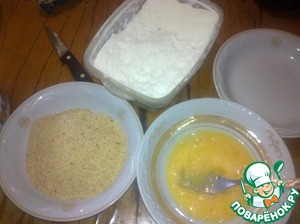 • Пока маринуется рыбка 10-15 минут готовим сопуствующие продукты... мука, взбитые яйца и панировочные сухари
