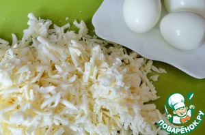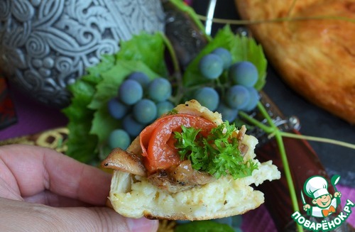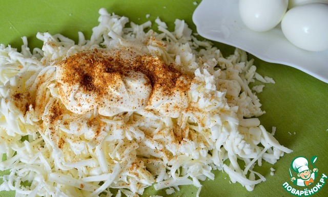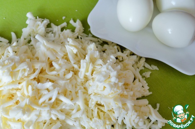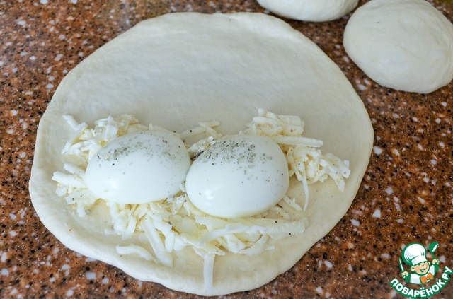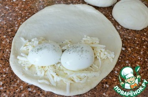 Выложить по 2 ст. л. сулугуни и яйцо, разрезанное пополам.