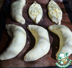 Скрутить рулетом, сформовать пирожки полумесяцем.