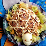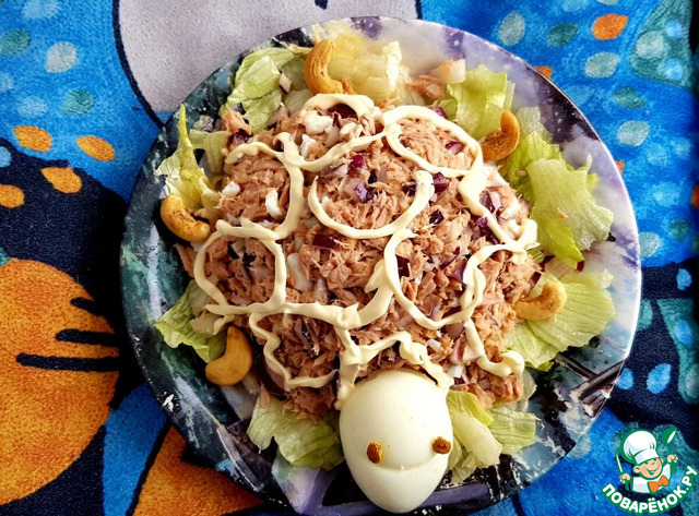На листья салата горкой выложить смесь, из оставшегося яйца сделать голову черепахи, из перца-глаза, из кешью-ноги и хвостик. Майонезом нарисовать панцирь.