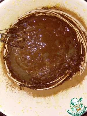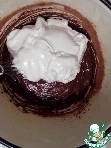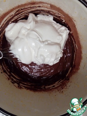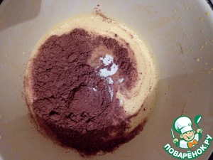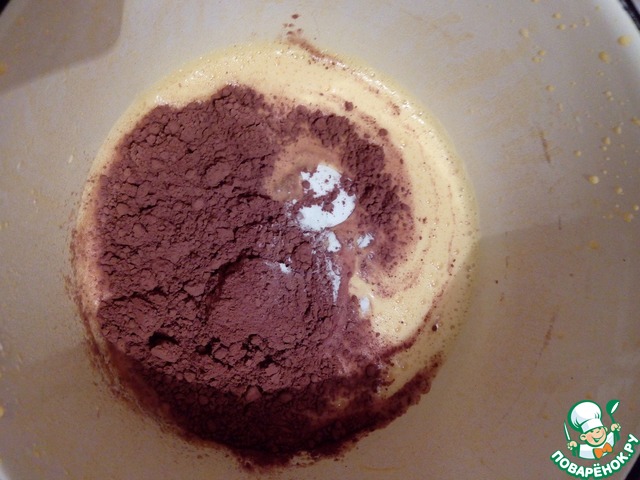 Желтки растираем со сметаной, затем вводим какао и соду, тщательно перемешиваем.