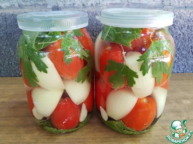 На дно пропаренных банок кладём смородиновый лист и чеснок, затем плотно укладываем помидоры, перекладывая луком.
