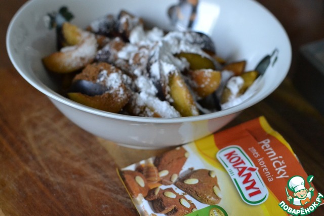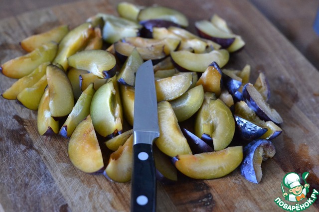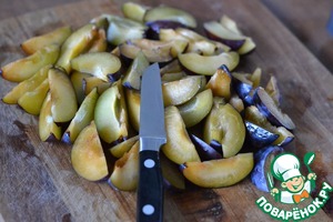 Сливы помыть, разрезать пополам, удалить косточку и нарезать на кусочки.