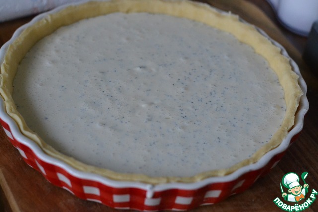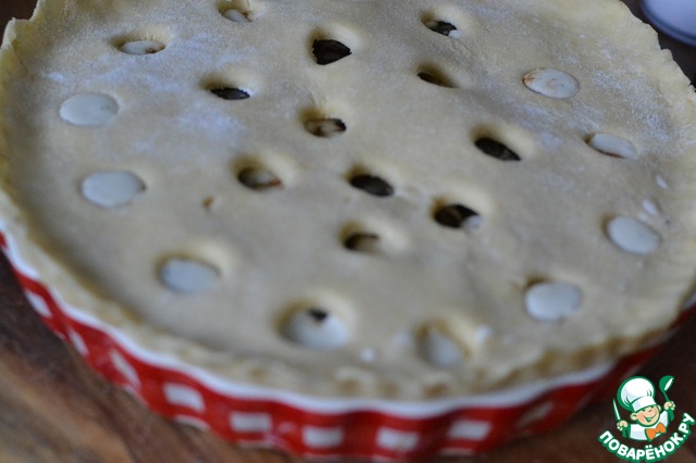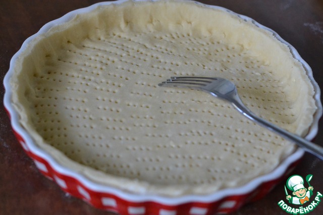 Вторую часть теста выкладываем в форму для выпечки диаметром 20см. Формируем бортики. Проколость тесто вилкой и оставить в холодильнике на 30 минут.